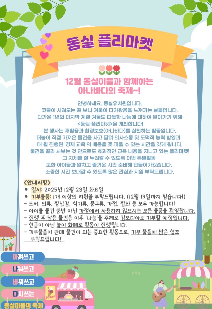 12월 23일 (화)에 ‘동실 플리마켓’이 진행될 예정입니다! ‘물건이 다시 쓰인다는 것’, ‘필요한 사람이 쓰면 더 큰 가치가 생길 수 있다는 것’을 느껴보는 시간이 될 것 같습니다!