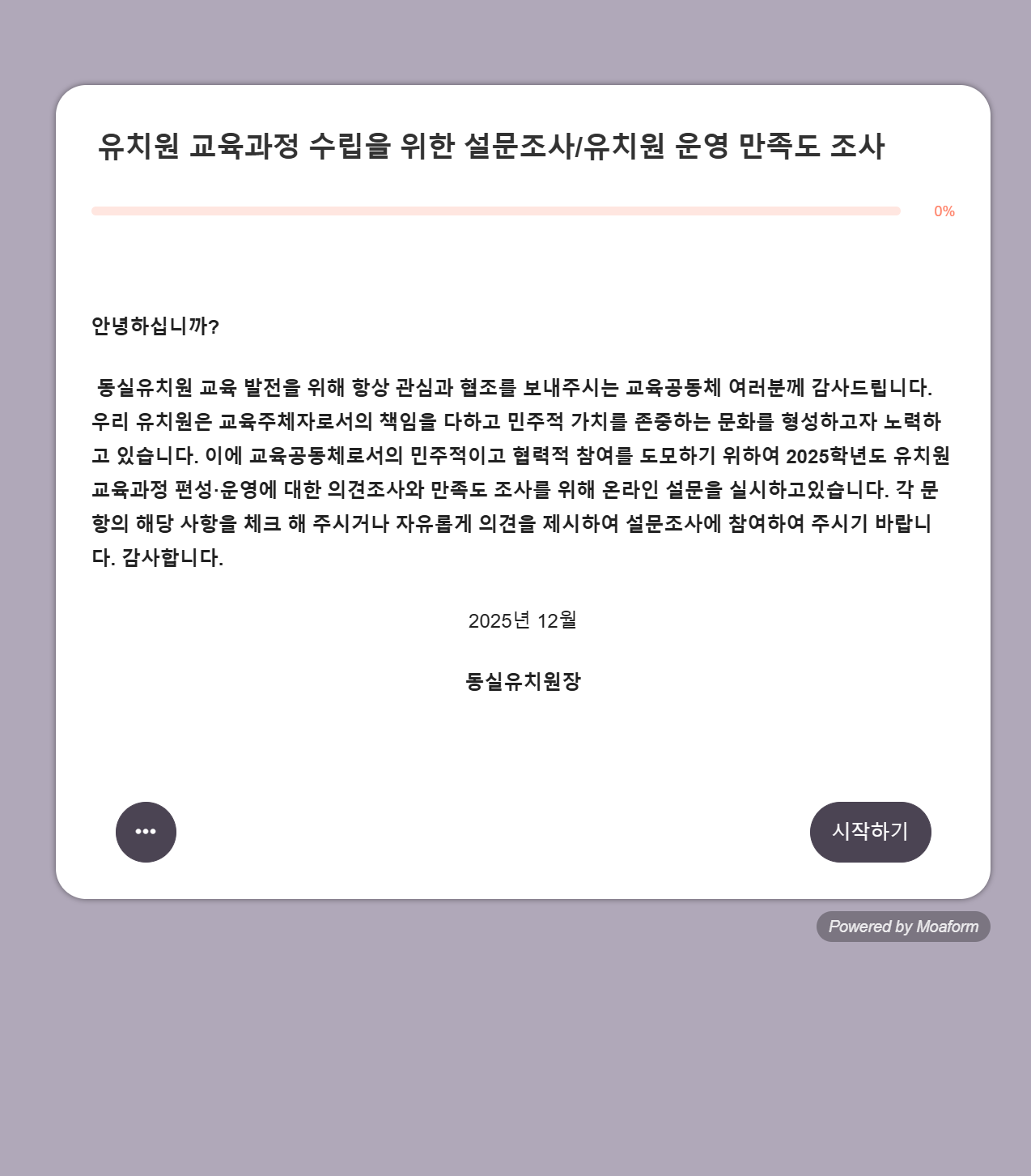 유치원 교육과정 수립을 위한 조사지 링크를 올려드립니다! 동실유치원의 교육적 가치를 더욱이 키워가기 위하여 바쁘시겠지만 꼭 설문조사에 참여해주시기를 부탁드리고자 한 번 더 말씀드리게 되었습니다~
